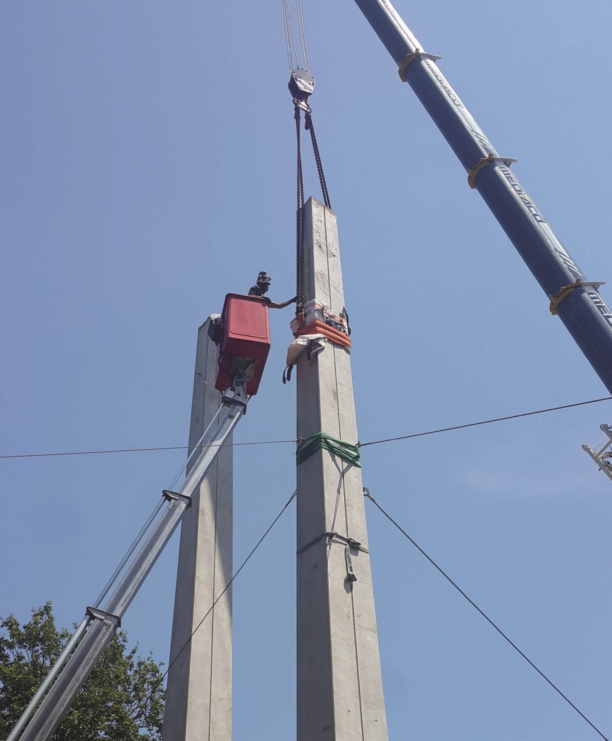 « Un chantier particulier, déclare également M. Meissonnier, Conducteur de Travaux d’OMEXOM, en raison tout d’abord de sa proximité du centre pénitentiaire. Nous avons respecté des contraintes sécuritaires imposées, notamment en phase d’accueil des intervenants tout au long des travaux. Un chantier atypique aussi par le jumelage des poteaux KB. Ce choix technique de RTE permet une reprise de charge élevée : quatre poteaux KB par portique… Le jumelage s’est effectué au sol, dès le déchargement des poteaux, avec un serrage approprié. Le levage était bien sûr la phase délicate. Tout